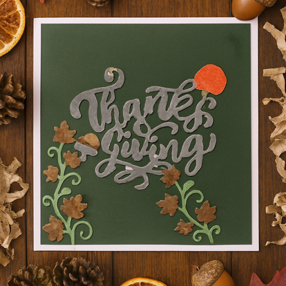 Celebrate the season of gratitude with this richly layered Thanksgiving card, crafted in deep forest green and adorned with swirling silver script. Embellished with earthy leaves, curling vines, and a warm pumpkin accent, it’s a tactile tribute to autumn’s beauty and heartfelt connection.