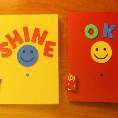 Brighten someone’s day with these playful, handmade cards—each one crafted with bold colours, smiley faces, and a touch of character charm. The yellow “SHINE” card and red “OK” card come with a free mini shoe charm tucked inside, featuring the exact cute characters shown in the photo: a blue monster and a red one-eyed buddy. These shoe charms are perfect for kids’ backpacks, pencil cases, or just as a joyful surprise.