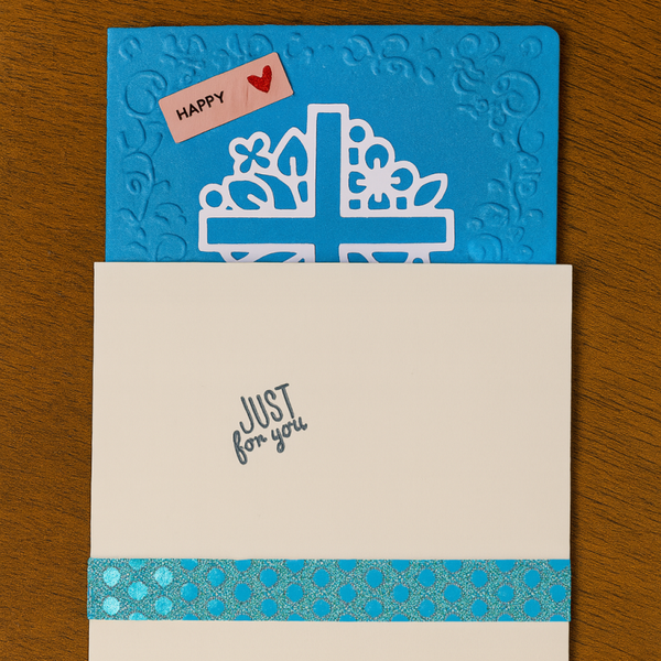 • Materials: emboss folder, floral, cross-shaped die cut, washi tape, blue and cream cardstock, Card sentiments.