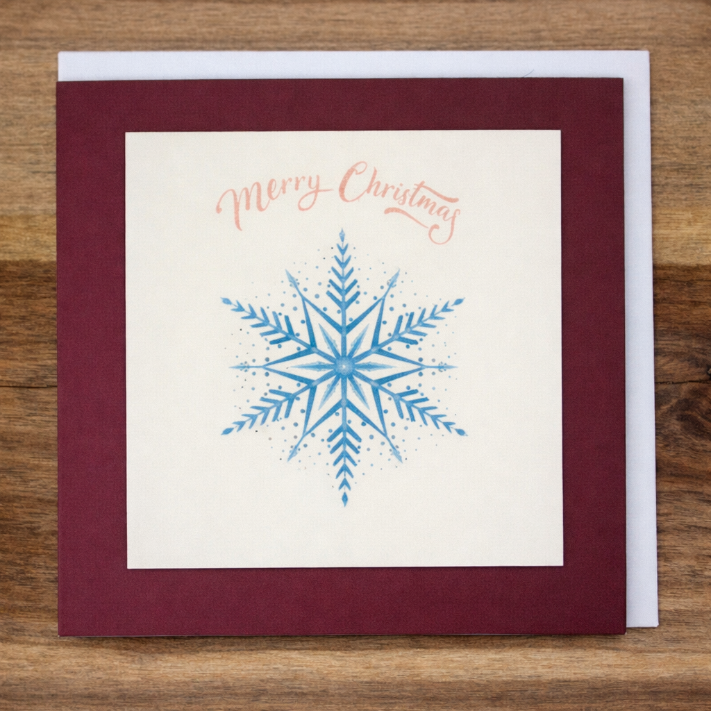 Send winter wishes with this handcrafted card featuring a striking blue snowflake framed by a rich burgundy border. The soft cream centre and delicate “Merry Christmas” message in pale pink cursive evoke a sense of peace and celebration.