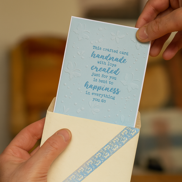 A delicately crafted card designed to uplift and comfort. Embossed butterflies and scattered dots dance across a soft blue background, framing a heartfelt message stamped in varying shades of blue. The words “handmade with love” and “happiness” stand out in graceful cursive, offering warmth and sincerity to the recipient.