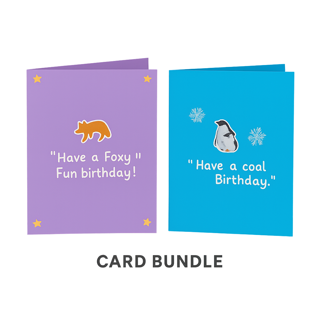 • Purple Fox Card – A bright, cheeky fox with the message “Have a foxy fun birthday!” (or whichever wording you used)