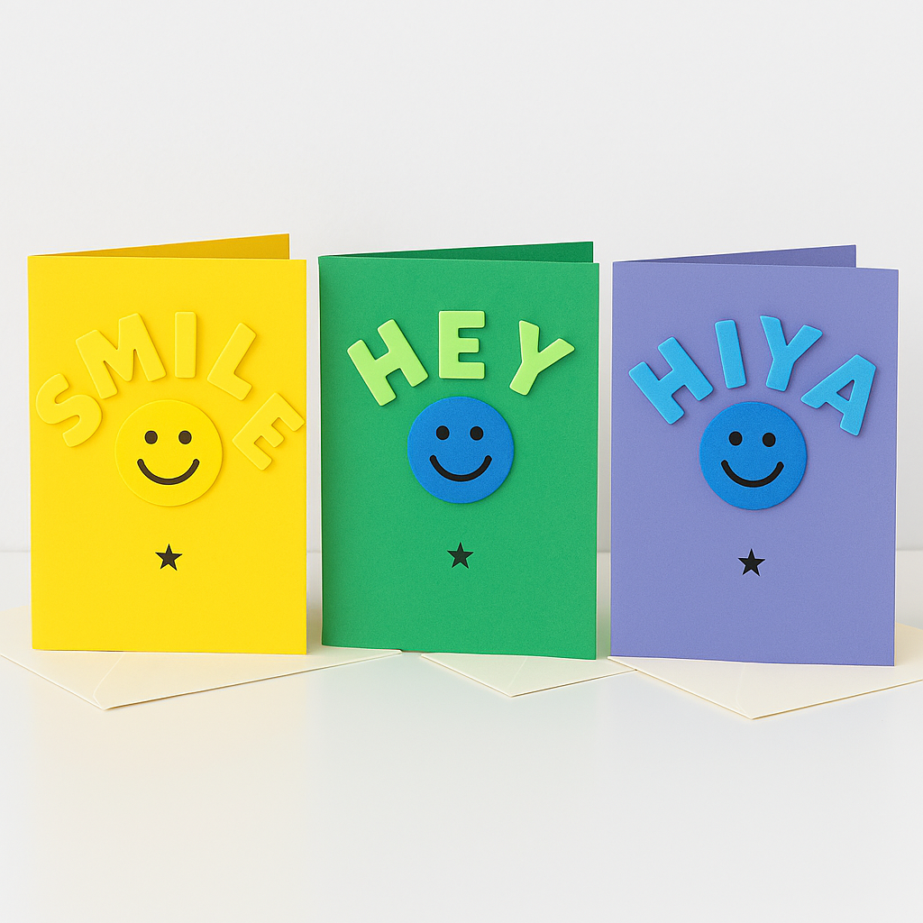 Bright, bold and full of cheer — this handmade 3‑pack of kids’ cards is designed to make little ones smile. Each card features raised foam letters, a friendly smiley face, and a tiny black star for a playful finishing touch. Perfect for birthdays, lunchbox notes, party bags, or just sending a happy hello.