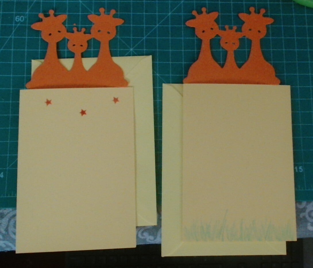 Both designs come on sunny yellow card bases with handmade details — one decorated with red stars, the other with hand‑drawn green grass — giving you a lively, joyful pair that feels truly unique.
