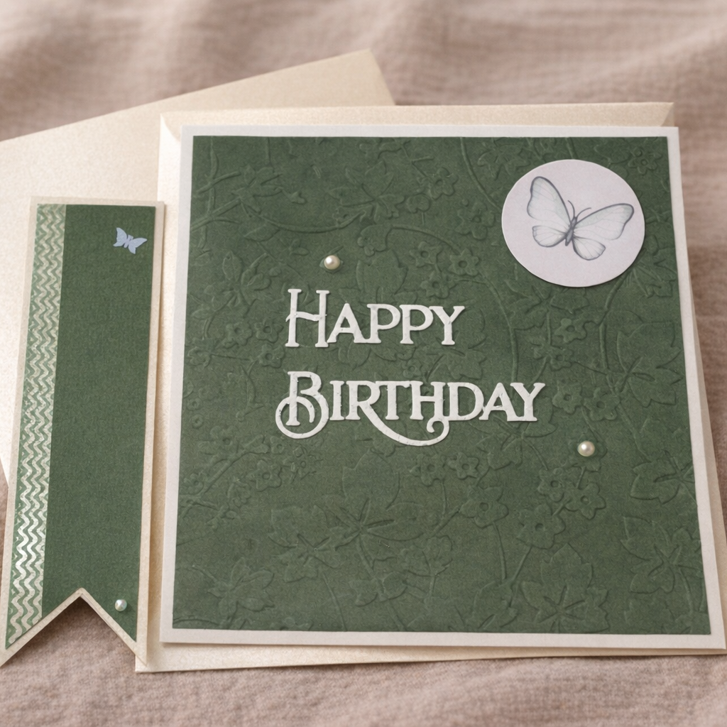 A calm, elegant birthday card crafted in deep embossed green, paired with a coordinated handmade bookmark and a creamy shimmer envelope.