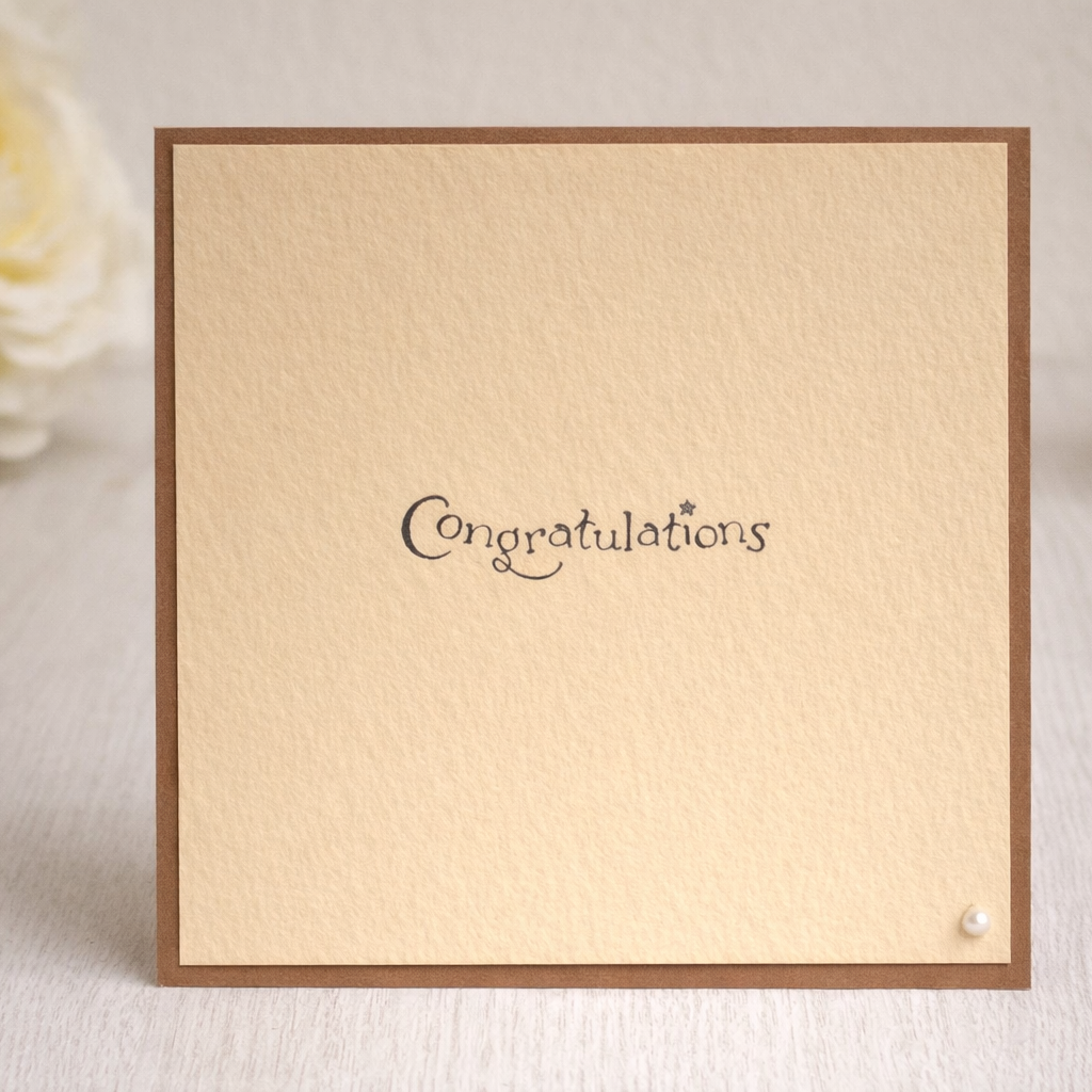 A clean and professional handmade congratulations card, crafted on a warm brown 6×6 base with a textured cream panel and a stamped sentiment. Finished with a single pearl for a subtle, boutique touch — perfect for colleagues, promotions, achievements, and special milestones.