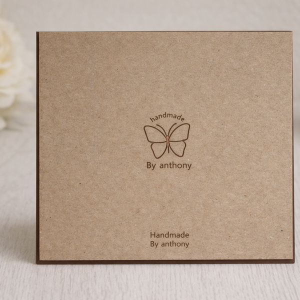 The back of the card is stamped with my signature butterfly and “Handmade by Anthony” mark — a gentle reminder that every card is crafted with care in my Uttoxeter studio.
